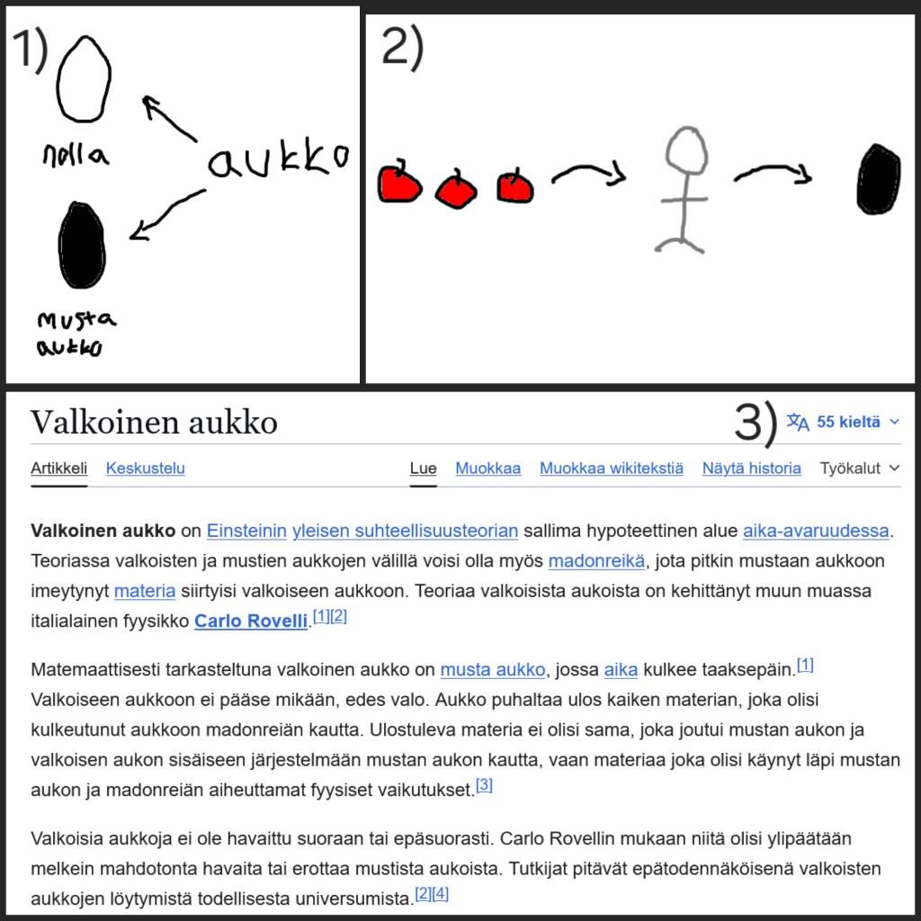 Musta aukko on äärimmäisen tiheä massakeskittymä, jonka tilavuus on lähellä nollaa. Se voi olla lähimpänä nollaa, mitä koskaan tulemme pääsemään. (1) Mutta se voi olla myös lähimpänä ääretöntä, mitä koskaan tulemme pääsemään, sillä vaikka avaruus olisi ääretön, emme voi sitä empiirisesti todistaa. Ovatko siis nolla ja ääretön sama? Ainakin ne esiintyvät yhdessä, samantasoisina käsitteinä. Kaikkeus ja ei mitään riippuvat näkökulmasta, ja niitä on vaikea edes ajatella rationaalisesti. Mustan aukon olemassaolo vihjaa valkoisesta aukosta, jonka tilavuus on lähellä ääretöntä ja tiheys tai massa nollaa. (Ilmeisesti valkoinen aukko on oikea käsite (3).)